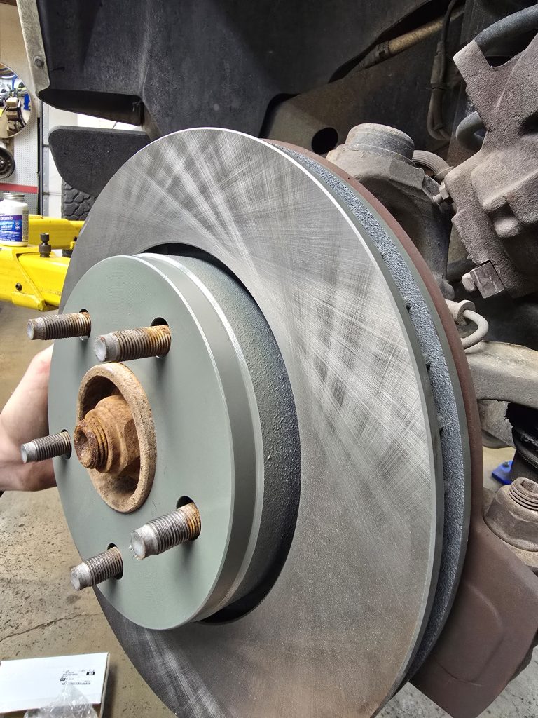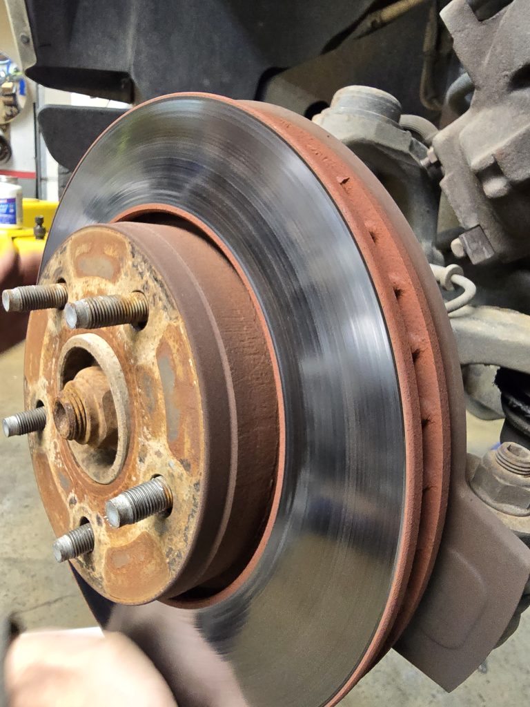 Over time, the extreme heat generated by braking can cause these metal discs to “warp” or develop uneven thickness. When the pads hit those high and low spots on a warped rotor, the vibration travels up the steering column and directly into your hands. Below you can see a rotor that was warped and required replacement. We generally replace Brake Pads and Rotors at the same time. This ensures no reoccurring issues!