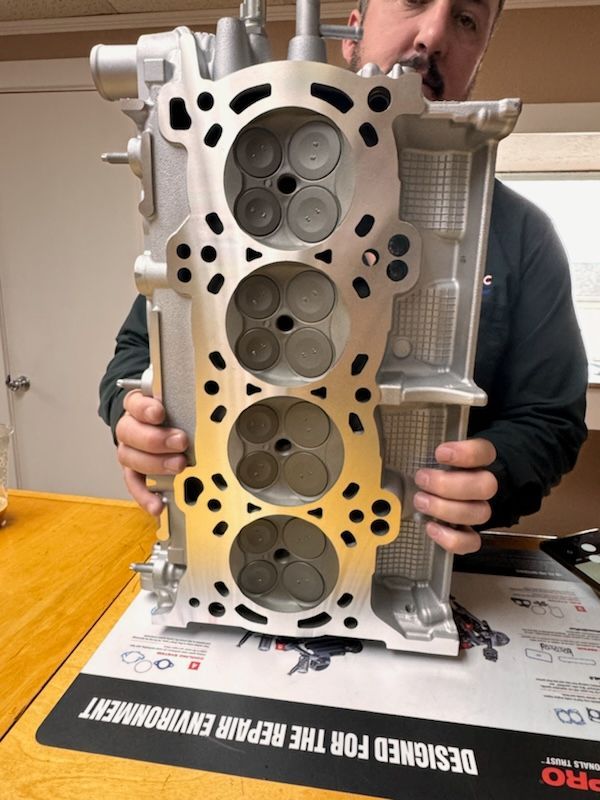 The Cylinder Head Gasket or Head Gasket is the main seal between the Engine Block and the Cylinder Head. It ensures that the engine can run properly and build enough pressure to fire each cylinder. The most common cause of a Cylinder Head Gasket leak is vehicle Overheating. When the engine begins to overheat it can cause the cylinder head and engine block to warp. This creates the Head Gasket Leak. A head gasket can leak internally or externally. In an internal leak the coolant leaks into the combustion chamber. This can cause Misfires, Poor Running, and even further Overheating. This is the mating surface of the Cylinder head.